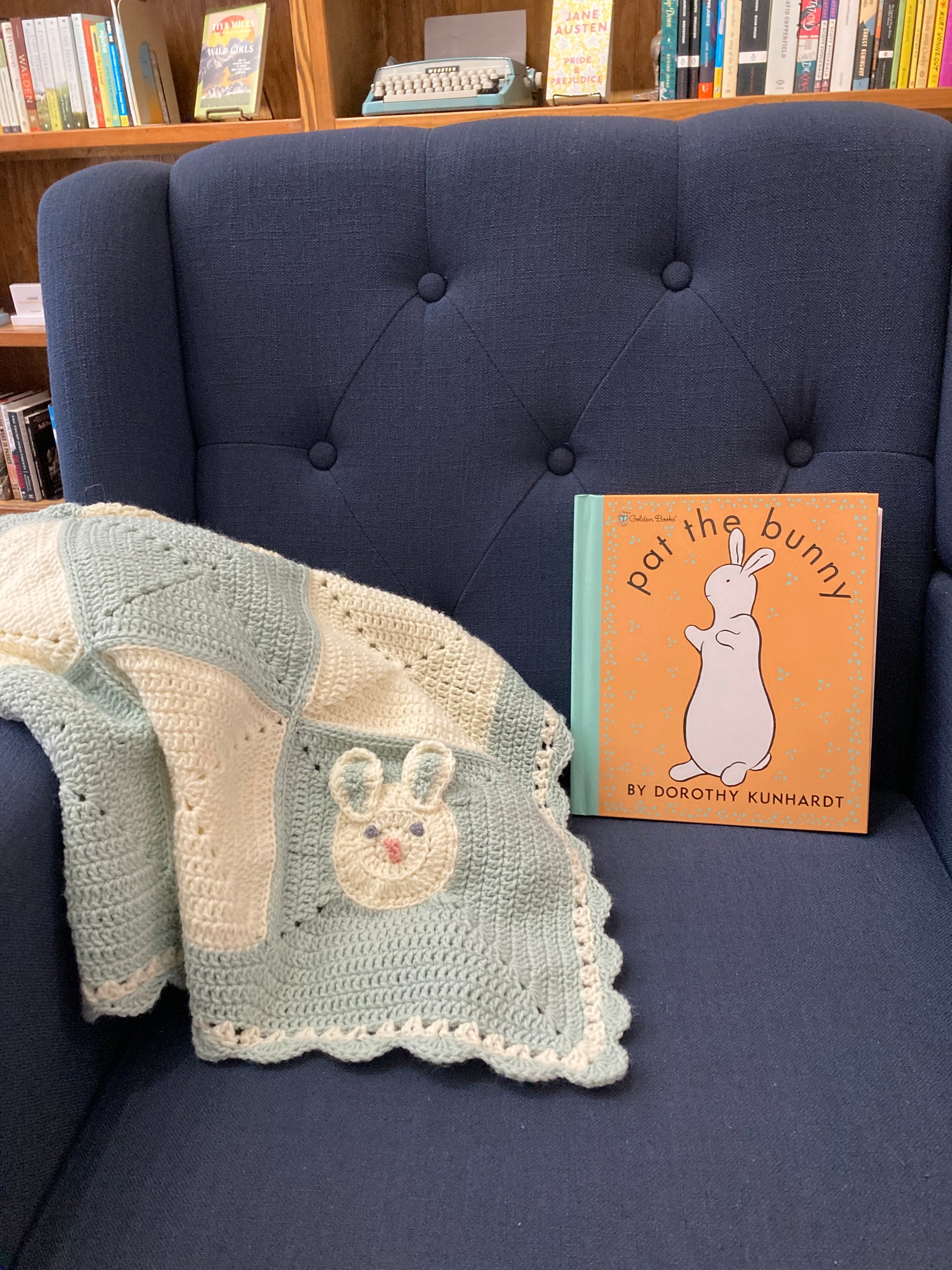 This handmade baby blanket is as sweet and soft as it looks! It makes a perfect baby shower gift, especially paired with the Pat the Bunny book, available in a separate listing. The blanket measures approximately 34” square.